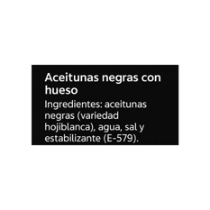 Ingredientes: Aceitunas negras, agua, sal y estabilizante (E-579)