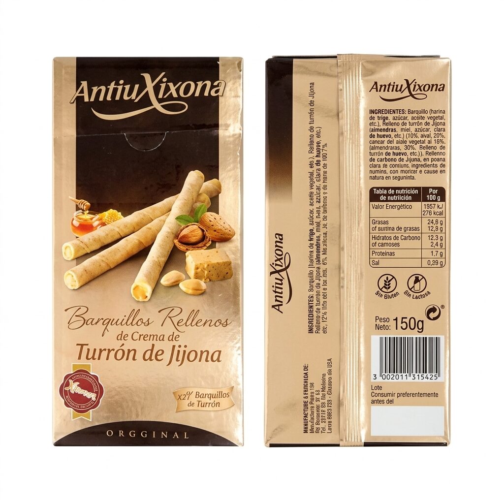 Ingredientes: Azúcar, harina de trigo, turrón de Jijona 22% (almendra tostada, azúcar, miel, azúcar líquido invertido), clara de huevo, aceite vegetal de palma, almidón de trigo, miel, leche desnatada en polvo, yema de huevo en polvo, sal, suero lácteo en polvo, aromas, colorantes (caramelo de sulfito amónico, norbixina de Bixa), emulgente: lecitinas (soja), antioxidantes (palmitato de ascorbilo, extractos naturales ricos en tocoferoles). Entincellantes. Contiene 60% de relleno de crema de turrón. Puede contener otros frutos de cáscara, cacahuete y mostaza.