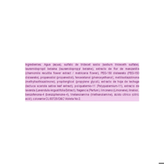 Agua, sulfato de tridecet sodio, lauramidopropil betaína, extracto de flor de manzanilla, PEG-150 distearato , propanodiol (Propanediol), fenoxietanol, metilisotiazolinona, propilenglicol, extracto de hoja de lechuga, poliquaternio-11, extracto de lavanda , fragancia, limoneno, linalool, benzofenona-4, trietanolamina, ácido cítrico, colorante CL 60725/D&C violeta No 2.
