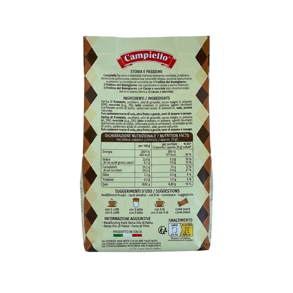 Ingredientes: Aceite de girasol, manteca de cacao 5%, cacao en polvo, avellanas 0,6%, harina de trigo, gasificantes preparados, bicarbonato de amonio, carbonato de sodio, proteínas de lino, aromas. Puede contener trazas de fruto secos.
