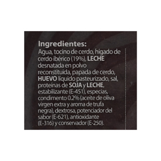 Ingredientes: Agua, tocino de cerdo, hígado de cerdo ibérico (19%), leche desnatada en polvo reconstituida, papada de cerdo, huevo líquido pasteurizado, sal, proteínas de soja y leche, estabilizante (E-451), especias, condimento 0.2% (aceite de oliva virgen extra y aroma de trufa negra), dextrosa, potenciador del sabor (E-621), antioxidante (E-316) y conservador (E-250). Sin gluten