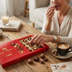 Surtido de bombones que ofrece una selección de variedades distintas de chocolate. El producto incluye una mezcla de chocolates negros, blancos y con leche, combinados con diversos ingredientes como praliné de avellana, trocitos de cereales, caramelo, notas de naranja y otros frutos de cáscara. Entre sus piezas destacan rellenos cremosos y texturas crujientes, todo presentado en un formato de 103 gramos diseñado para ofrecer una experiencia variada en cada bocado.