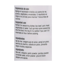 Ingredientes: Sal de mar, oregano, ajo en polvo, perejil en polvo, semilla de cilantro, cebolla en polvo, pimienta negra molida y especias.