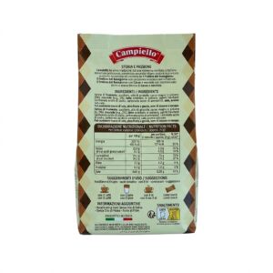 Ingredientes: Aceite de girasol, manteca de cacao 5%, cacao en polvo, avellanas 0,6%, harina de trigo, gasificantes preparados, bicarbonato de amonio, carbonato de sodio, proteínas de lino, aromas. Puede contener trazas de fruto secos. País de origen: Italia