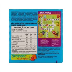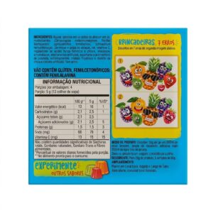 Ingredientes: Azúcar, gelatina en polvo, pulpa de uva (pulpa y maltodextrina), sal, vitamina C, reguladores de acidez (acido fumárico y citrato de sodio), aroma idéntico al natural de uva, edulcorantes artificiales (aspartamo y acessulfame de potasio), antihumectante (fosfato tricalcio y dióxido de silício), y colorantes artificiales amaranto y azul brillante. Fuente de vitamina C. No…